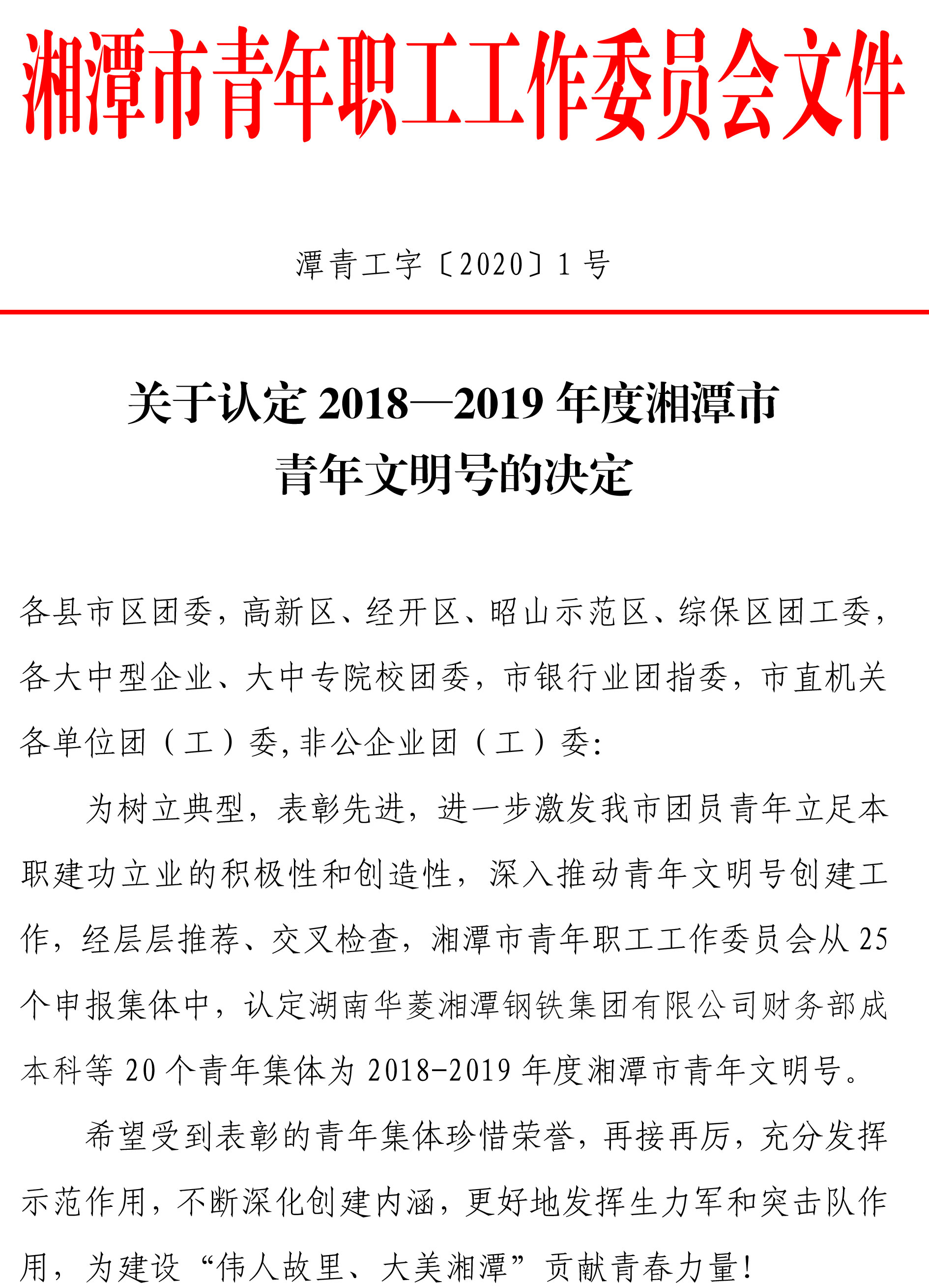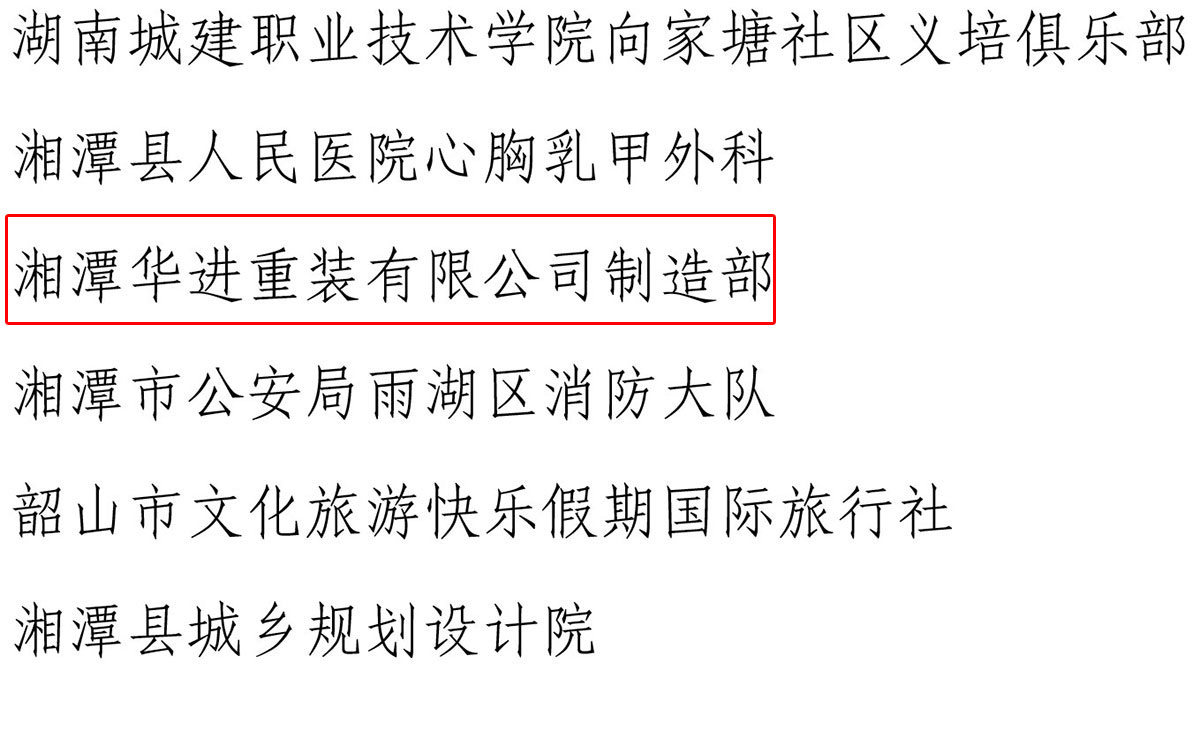 為樹立典型,表彰先進(jìn),進(jìn)一步激發(fā)湘潭市團(tuán)員青年立足本職建功立業(yè)的積極性和創(chuàng)造性,深入推動青年文明號創(chuàng)建工作,經(jīng)層層推薦、交叉檢查,湘潭市青年職工工作委員會從 25個申報(bào)集體中,認(rèn)定湘潭華進(jìn)重裝有限公司制造部等 20 個青年集體為 2018-2019 年度湘潭市青年文明號。