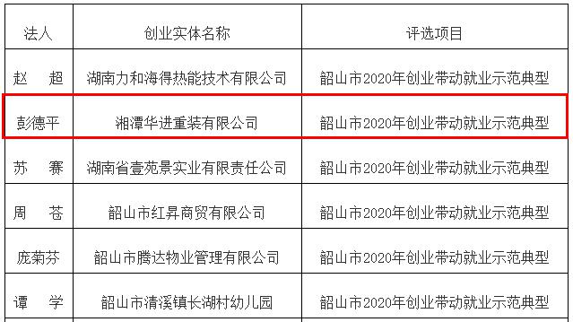 2020年12月1日根據(jù)《關(guān)于印發(fā)<韶山市就業(yè)安置基地(精準就業(yè)扶貧愛心單位)創(chuàng)建評選活動實施方案(試行)>的通知》(韶人社發(fā)〔2019〕5號)《韶山市2020年“創(chuàng)業(yè)之星”評選獎勵工作實施方案》(韶創(chuàng)辦發(fā)〔2020〕1號)《韶山市開展創(chuàng)業(yè)帶動就業(yè)示范典型評選獎勵工作實施方案(試行)》(韶人社發(fā)〔2020〕8號)文件精神,通過單位申報,鄉(xiāng)鎮(zhèn)、高新區(qū)推薦,市人社局、市科工信局、市財政局、市扶貧辦等成員單位實地考察,韶山市創(chuàng)新創(chuàng)業(yè)工作領(lǐng)導(dǎo)小組研究,評選湘潭華進重裝有限公司等19家企業(yè)為韶山市2020年度創(chuàng)業(yè)帶動就業(yè)示范典型、韶山市2020年度“創(chuàng)業(yè)之星”12家、韶山市精準就業(yè)扶貧愛心單位5家,共36家單位。
